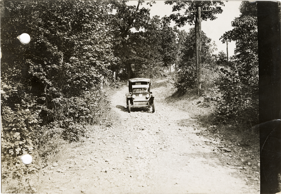 View of Flanders electric car traveling on rural dirt road near Lawrenceburg, Tennessee during the pathfinding expedition for the 1912 Glidden Tour. The pathfinding tour covered a route from Detroit, Michigan to New Orleans, Louisiana, but the 1912 Glidden Tour was canceled. Stamped on back: "Spooner & Wells, Inc., photographers, 1231 Woodward Ave., Detroit, Mich., telephone North 1745." Handwritten on back: "Sample of roads for twenty miles, near Lawrenceburg, Tenn. encountered by Pathfinder, 1912."