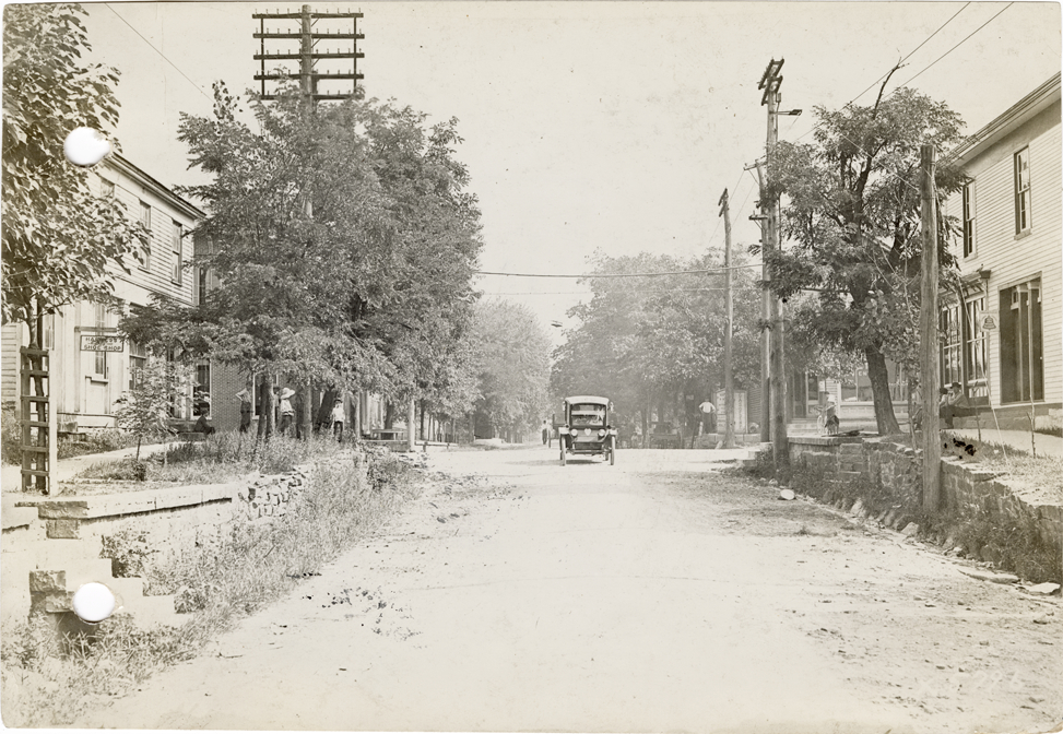 View of Flanders electric car traveling through New Haven, Kentucky during the pathfinding expedition for the 1912 Glidden Tour. The pathfinding tour covered a route from Detroit, Michigan to New Orleans, Louisiana, but the 1912 Glidden Tour was canceled. Stamped on back: "Spooner & Wells, Inc., photographers, 1231 Woodward Ave., Detroit, Mich., telephone North 1745." Handwritten on back: "Pathfinder through New Haven, Ky. from where Daniel Boone came. Abraham Lincoln farm near here, 1912."