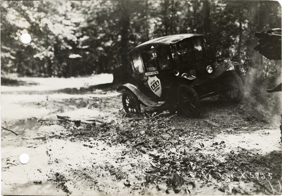 View of Flanders electric car in a swamp near Iuka, Mississippi during the pathfinding expedition for the 1912 Glidden Tour. The pathfinding tour covered a route from Detroit, Michigan to New Orleans, Louisiana, but the 1912 Glidden Tour was canceled. Handwritten on back: "Pathfinder in big swamp, nine miles from Iuka, 1912."
