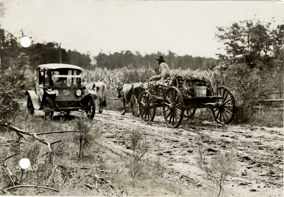 View of Flanders electric car passing a man driving an ox-drawn wagon near Iuka, Mississippi during the pathfinding expedition for the 1912 Glidden Tour. The pathfinding tour covered a route from Detroit, Michigan to New Orleans, Louisiana, but the 1912 Glidden Tour was canceled. Handwritten on back: "Pathfinder meeting a team of oxen near Iuka, Miss., 1912."