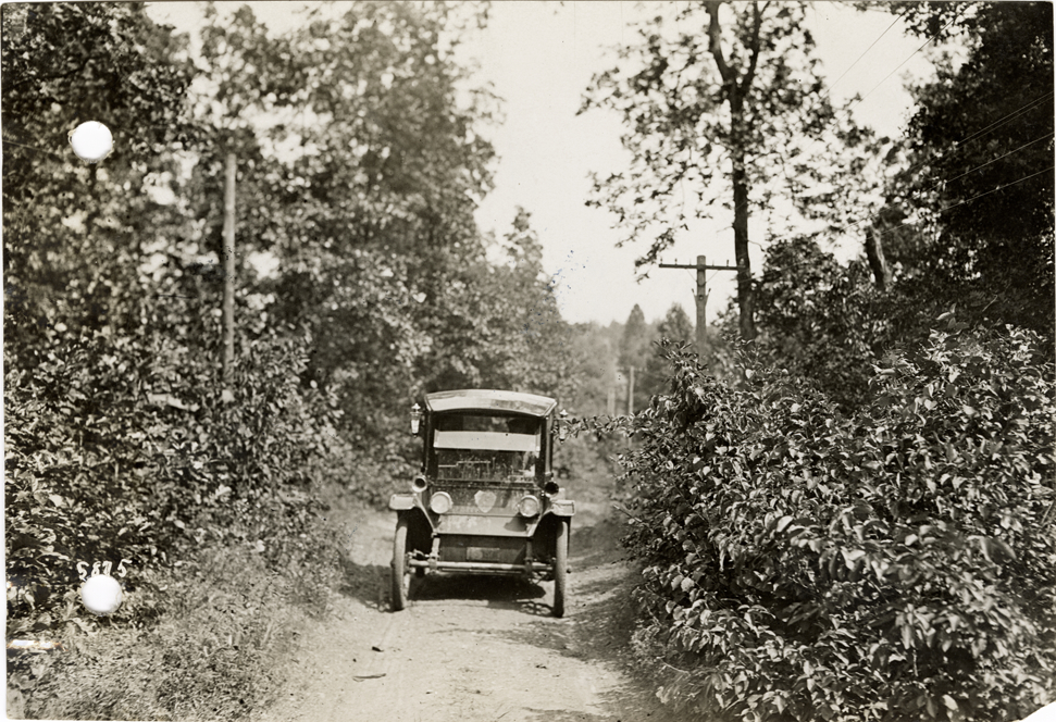 View of Flanders electric car traveling on a rural dirt road near Lawrenceburg, Tennessee during the pathfinding expedition for the 1912 Glidden Tour. The pathfinding tour covered a route from Detroit, Michigan to New Orleans, Louisiana, but the 1912 Glidden Tour was canceled. Stamped on back: "Spooner & Wells, Inc., photographers, 1231 Woodward Ave., Detroit, Mich., telephone North 1745." Handwritten on back: "Pathfinder among hills near Lawrenceburg, twenty miles from Nashville, Tenn., 1912."