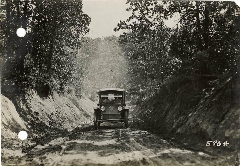 View of Flanders electric car traveling on dirt road between La Grange and Moscow, Tennessee during the pathfinding expedition for the 1912 Glidden Tour. The pathfinding tour covered a route from Detroit, Michigan to New Orleans, Louisiana, but the 1912 Glidden Tour was canceled. Stamped on back: "Spooner & Wells, Inc., photographers, 1231 Woodward Ave., Detroit, Mich., telephone North 1745." Handwritten on back: "Pathfinder up long steep hill near La Grange and Moscow, Tenn., 1912."