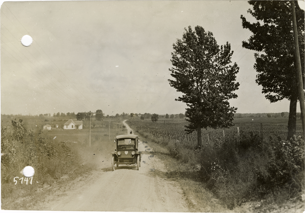 View of Flanders electric car traveling on rural dirt road near Seymour, Indiana during the pathfinding expedition for the 1912 Glidden Tour. The pathfinding tour covered a route from Detroit, Michigan to New Orleans, Louisiana, but the 1912 Glidden Tour was canceled. Stamped on back: "Spooner & Wells, Inc., photographers, 1231 Woodward Ave., Detroit, Mich., telephone North 1745." Handwritten on back: "The Pathfinder at Peaceful Valley, 10 miles from Seymour, 1912."