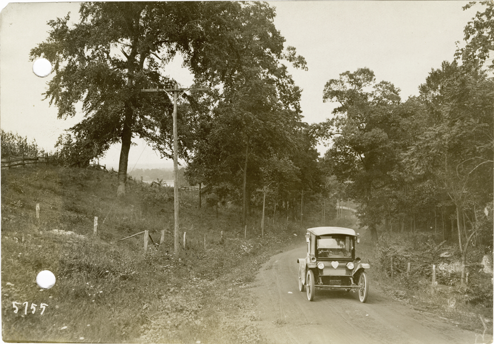View of Flanders electric car traveling on rural dirt road near Brownstown, Indiana during the pathfinding expedition for the 1912 Glidden Tour. The pathfinding tour covered a route from Detroit, Michigan to New Orleans, Louisiana, but the 1912 Glidden Tour was canceled. Stamped on back: "Spooner & Wells, Inc., photographers, 1231 Woodward Ave., Detroit, Mich., telephone North 1745." Handwritten on back: "The Pathfinder at a hill and view near Brownstown, 1912."