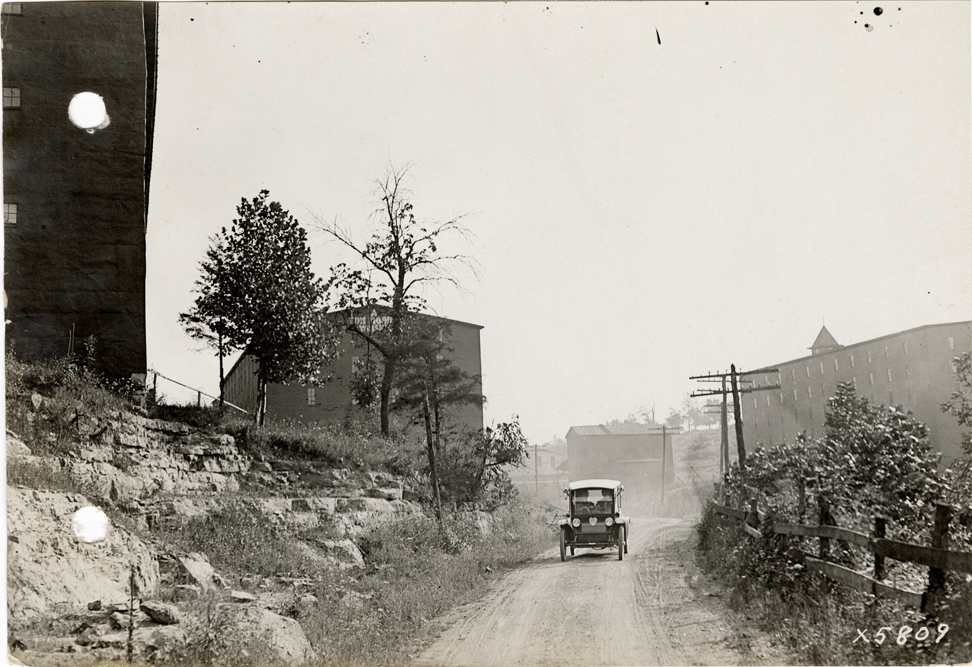 View of Flanders electric car passing the Tom Moore Distillery at Bardstown, Kentucky, during the pathfinding expedition for the 1912 Glidden Tour. The pathfinding tour covered a route from Detroit, Michigan to New Orleans, Louisiana, but the 1912 Glidden Tour was canceled. Handwritten on back: "Pathfinder past Tom Moore Distillery at Bardstown, 1912."