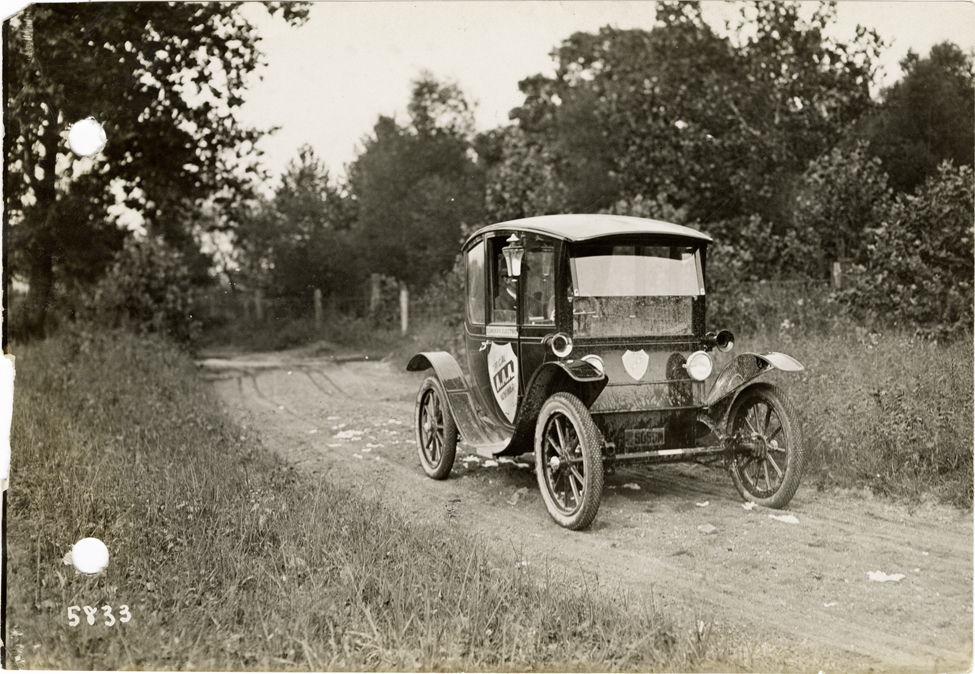 View of Flanders electric car traveling on rural dirt road near Goodlettsville, Tennessee during the pathfinding expedition for the 1912 Glidden Tour. The pathfinding tour covered a route from Detroit, Michigan to New Orleans, Louisiana, but the 1912 Glidden Tour was canceled. Stamped on back: "Spooner & Wells, Inc., photographers, 1231 Woodward Ave., Detroit, Mich., telephone North 1745." Handwritten on back: "Pathfinder in woods near Goodlettsville, Tenn., 1912."