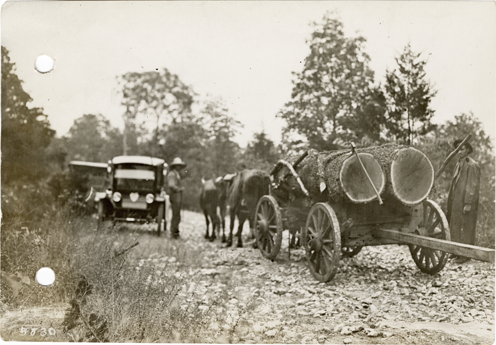 Flanders automobile passing team of oxen transporting logs, Kentucky, 1912 Glidden pathfinding expedition