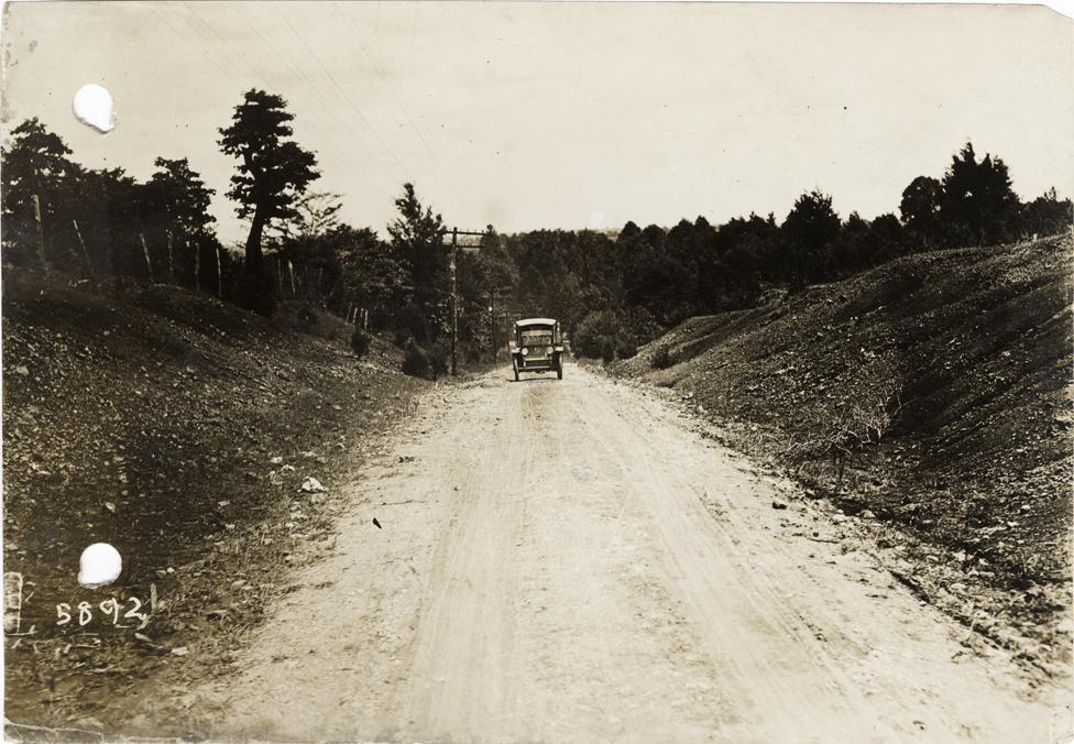 View of Flanders electric car traveling on rural dirt road near Tuscumbia, Alabama during the pathfinding expedition for the 1912 Glidden Tour. The pathfinding tour covered a route from Detroit, Michigan to New Orleans, Louisiana, but the 1912 Glidden Tour was canceled. Stamped on back: "Spooner & Wells, Inc., photographers, 1231 Woodward Ave., Detroit, Mich., telephone North 1745." Handwritten on back: "Pathfinder on road below Tuscumbia, Alabama, 1912."
