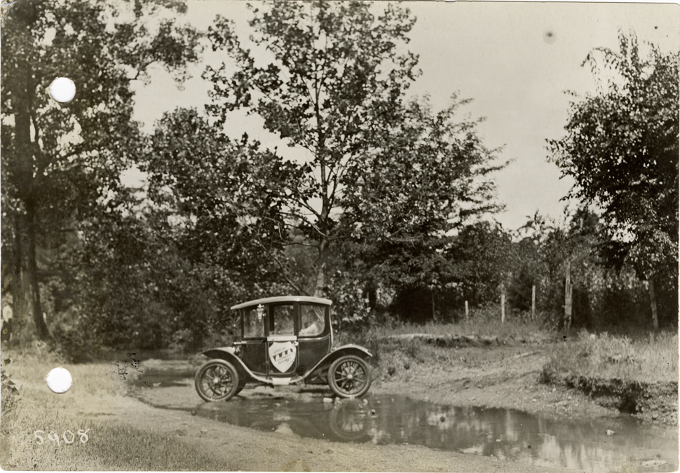View of Flanders electric car crossing small stream near Cherokee, Tennessee during the pathfinding expedition for the 1912 Glidden Tour. The pathfinding tour covered a route from Detroit, Michigan to New Orleans, Louisiana, but the 1912 Glidden Tour was canceled. Handwritten on back: "Ford near Cherokee, 1912."