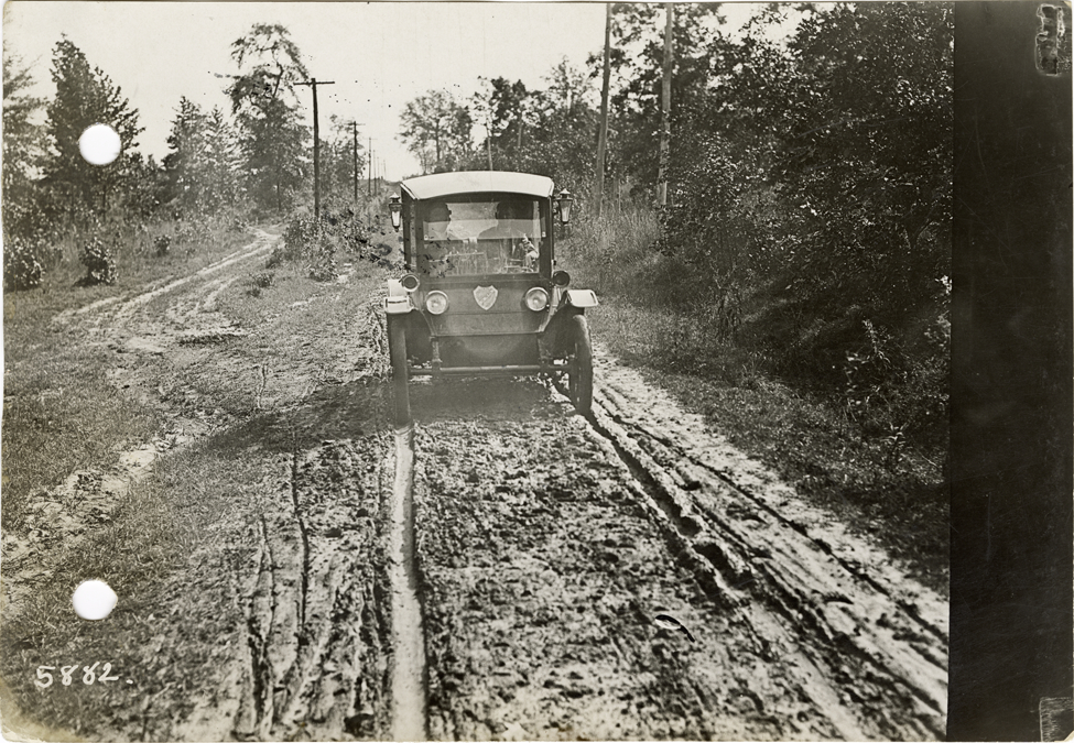 View of Flanders electric car traveling on rural dirt road near Lawrenceburg, Tennessee during the pathfinding expedition for the 1912 Glidden Tour. The pathfinding tour covered a route from Detroit, Michigan to New Orleans, Louisiana, but the 1912 Glidden Tour was canceled. Handwritten on back: "Sample of roads near Lawrenceburg, Tenn. for twenty miles. Pathfinding trip, 1912."