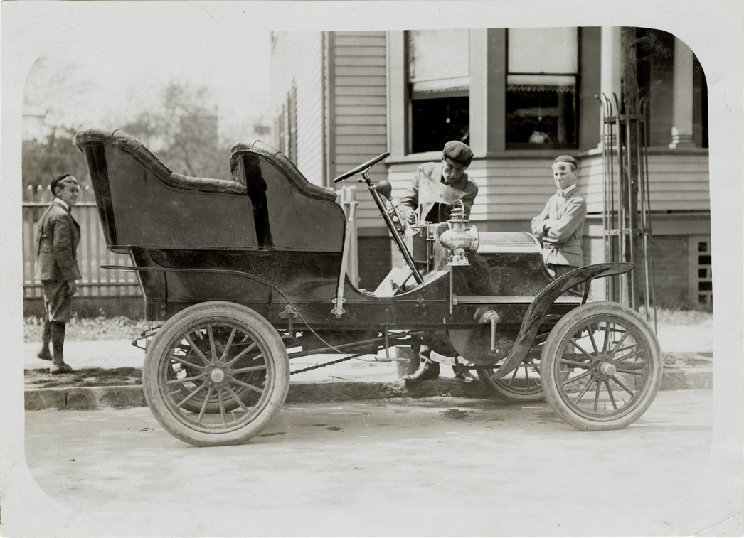 View of motorist with a Franklin car. Handwritten on back: "Franklin, ca. 1906."
