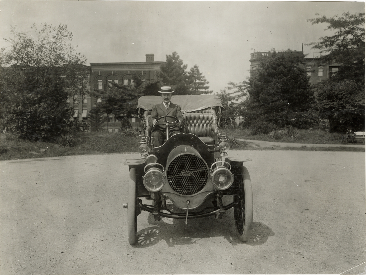 Front view of a motorist posing in a Franklin Six car. Handwritten on back: "Franklin Six, ca. 1907."