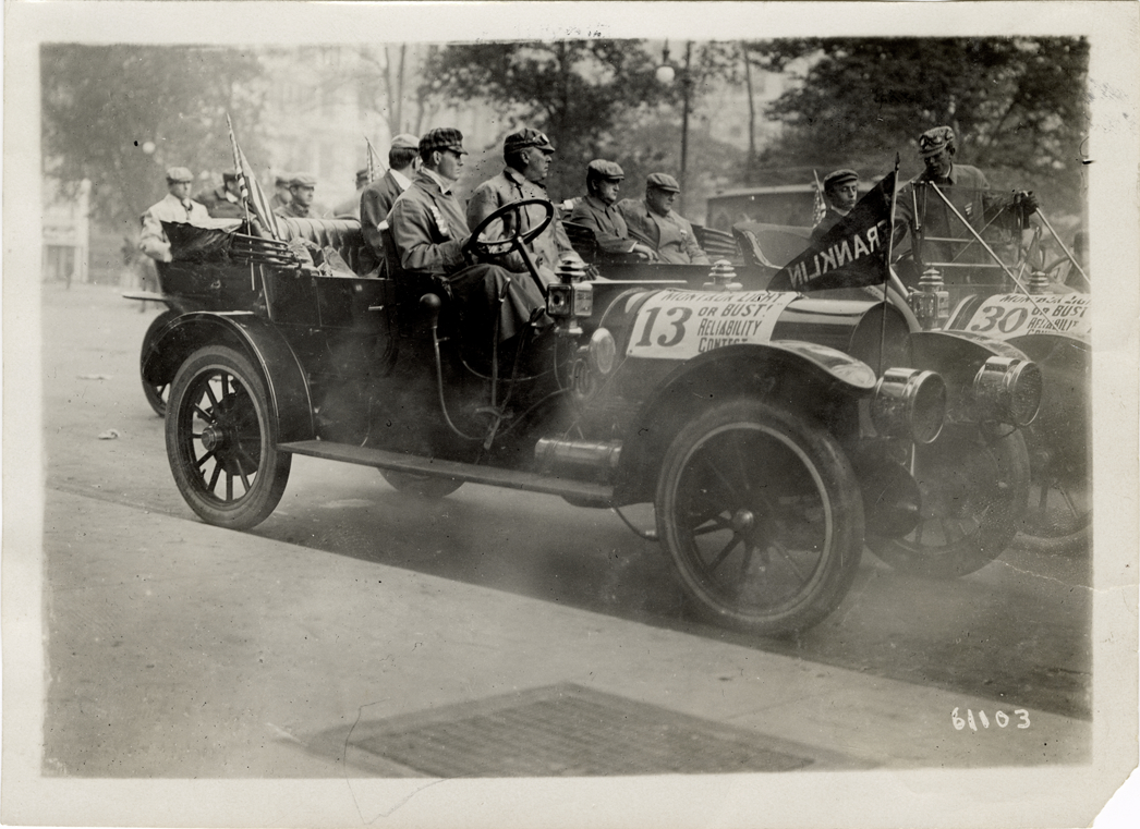 View of motorists in Franklin car no. 13 during the 1910 Montauk Point Reliability Run. Sponsored by the Motor Contest Association, the two-day endurance run, also known as the "Montauk Light or Bust" reliability run, took place on Long Island. Stamped on back: "Spooner & Wells, Inc., photographers, telephones 3472-3473 Columbus, 1931 Broadway, New York." Handwritten on back: "Franklin, ca. 1910."