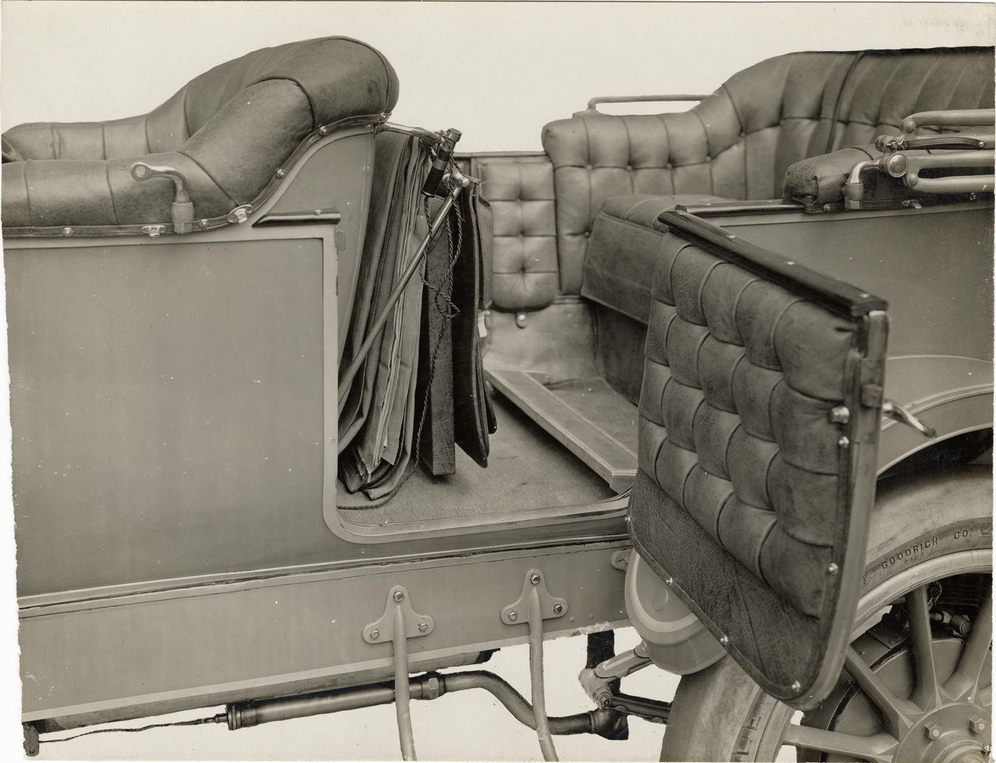 Close-up view of a Franklin car with open door showing interior and rear seat. Handwritten on back: "Franklin, ca. 1910."