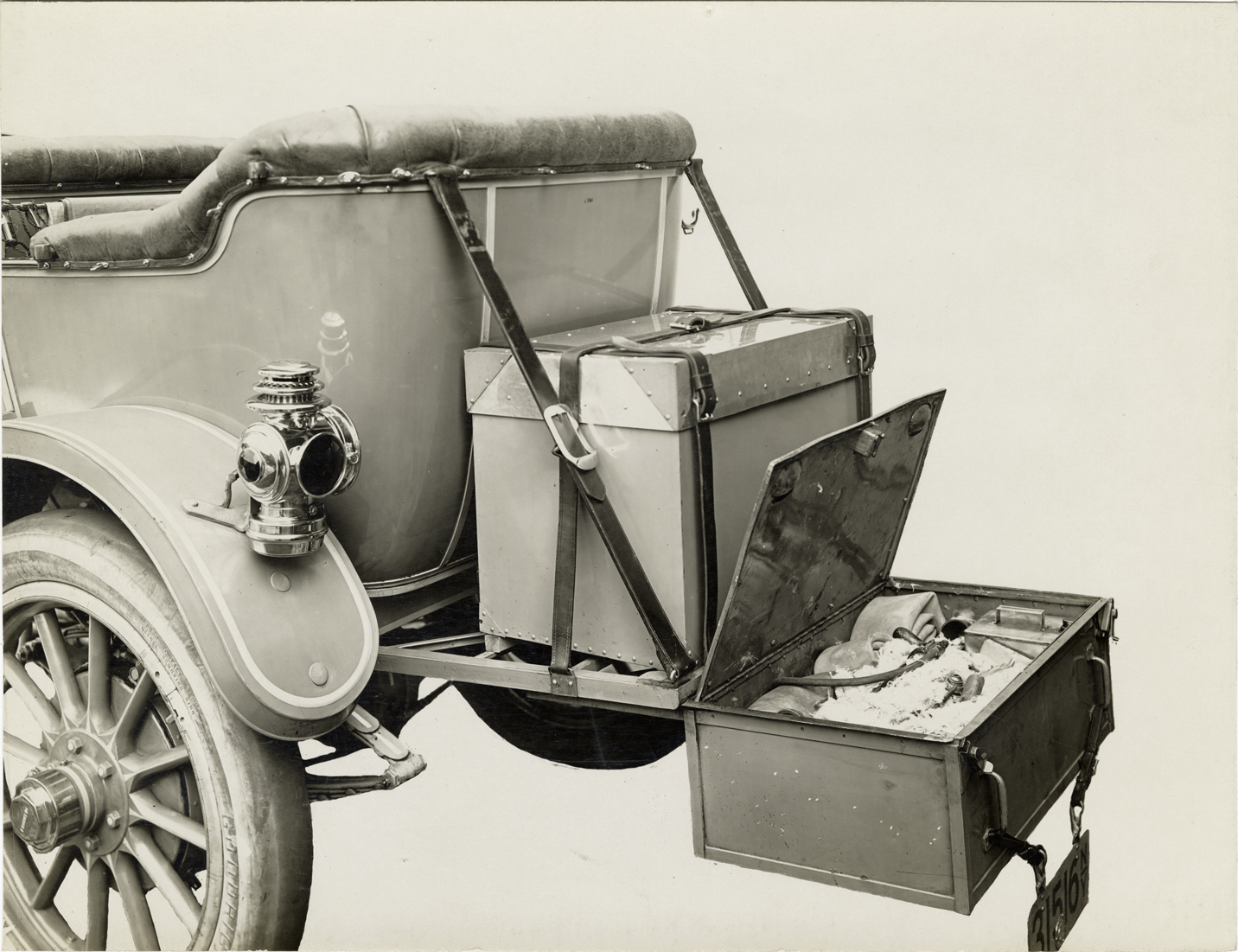 Close-up view of a Franklin car showing rear storage compartments. Handwritten on back: "Franklin, ca. 1910."