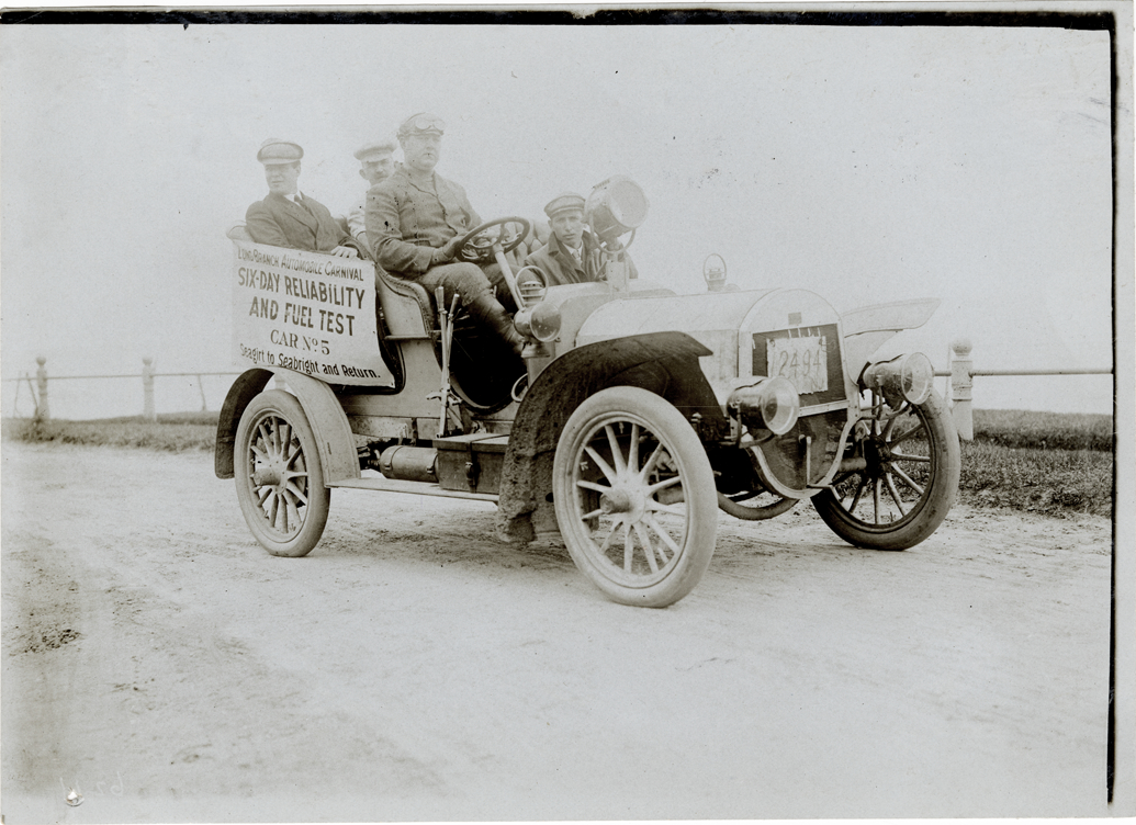 View of motorists in Frayer-Miller car no. 5 during the Long Branch Automobile Carnival Six Day Reliability and Fuel Test. Banner on car reads: "Long Branch Automobile Carnival Six Day Reliability and Fuel Test. Car no. 5. Seagirt to Seabright and return." Stamped on back: "Photo by F. Ed. Spooner, 1536 B'way, telephone 6536-38th St., New York, N.Y." Handwritten on back: "Frayer-Miller, a. 1905-6."