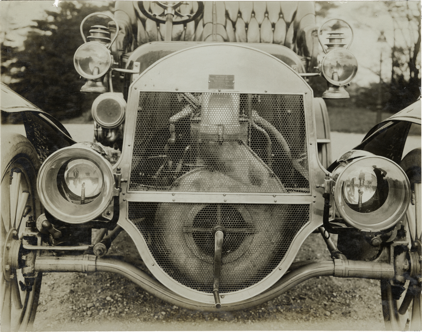 Close-up view of the front end of a Frayer-Miller car. Stamped on back: "Photo by F. Ed. Spooner, 1536 B'way, telephone 6536-38th St., New York, N.Y." Handwritten on back: "Frayer-Miller, ca. 1906."