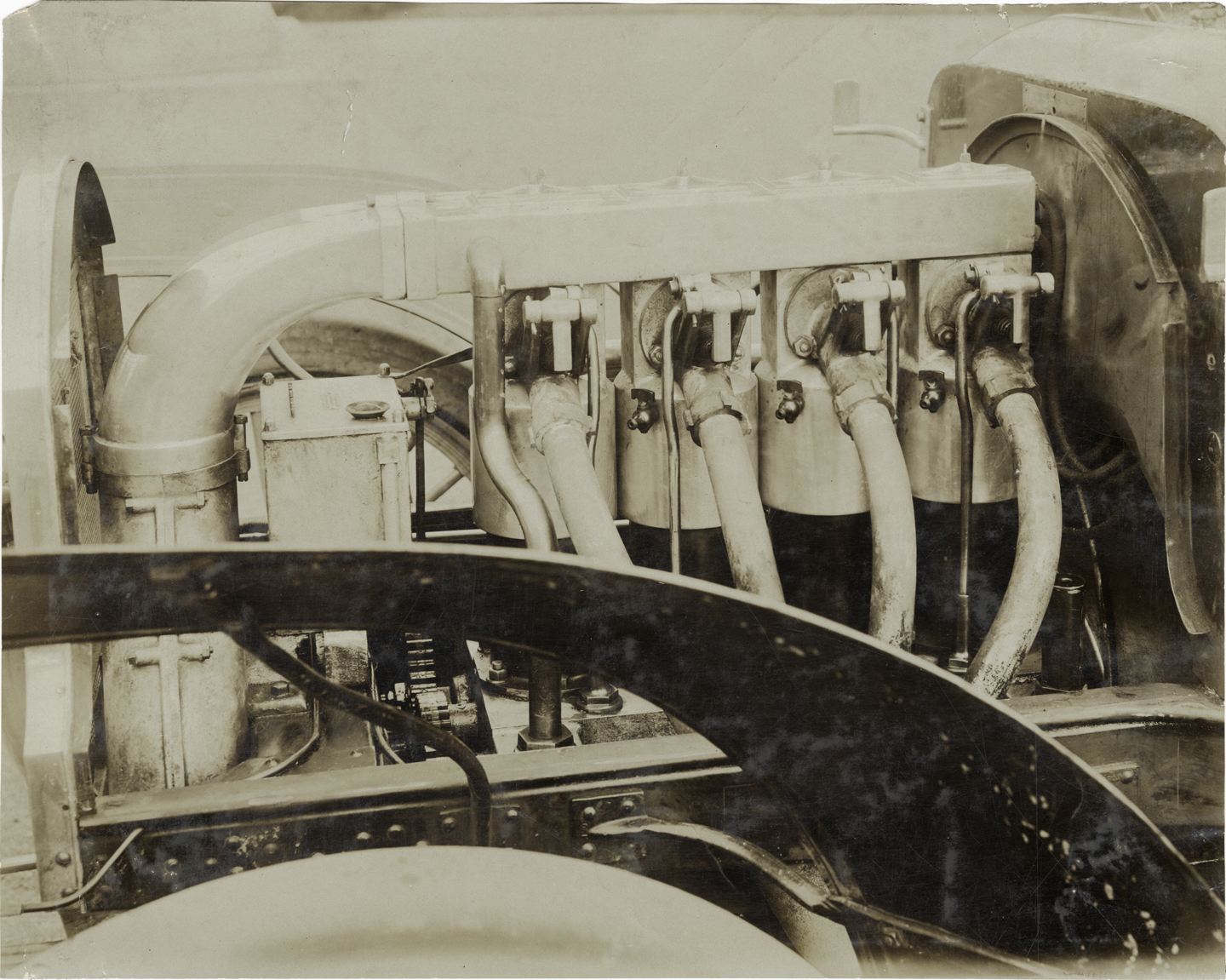 Close-up view of a Frayer-Miller car engine. Stamped on back: "Photo by F. Ed. Spooner, 1536 B'way, telephone 6536-38th St., New York, N.Y." Handwritten on back: "Frayer-Miller, ca. 1906."