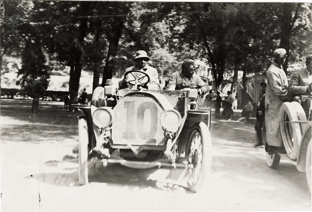 View of motorists in Gaeth car no. 10. Handwritten on back: "Gaeth, 1907-8."