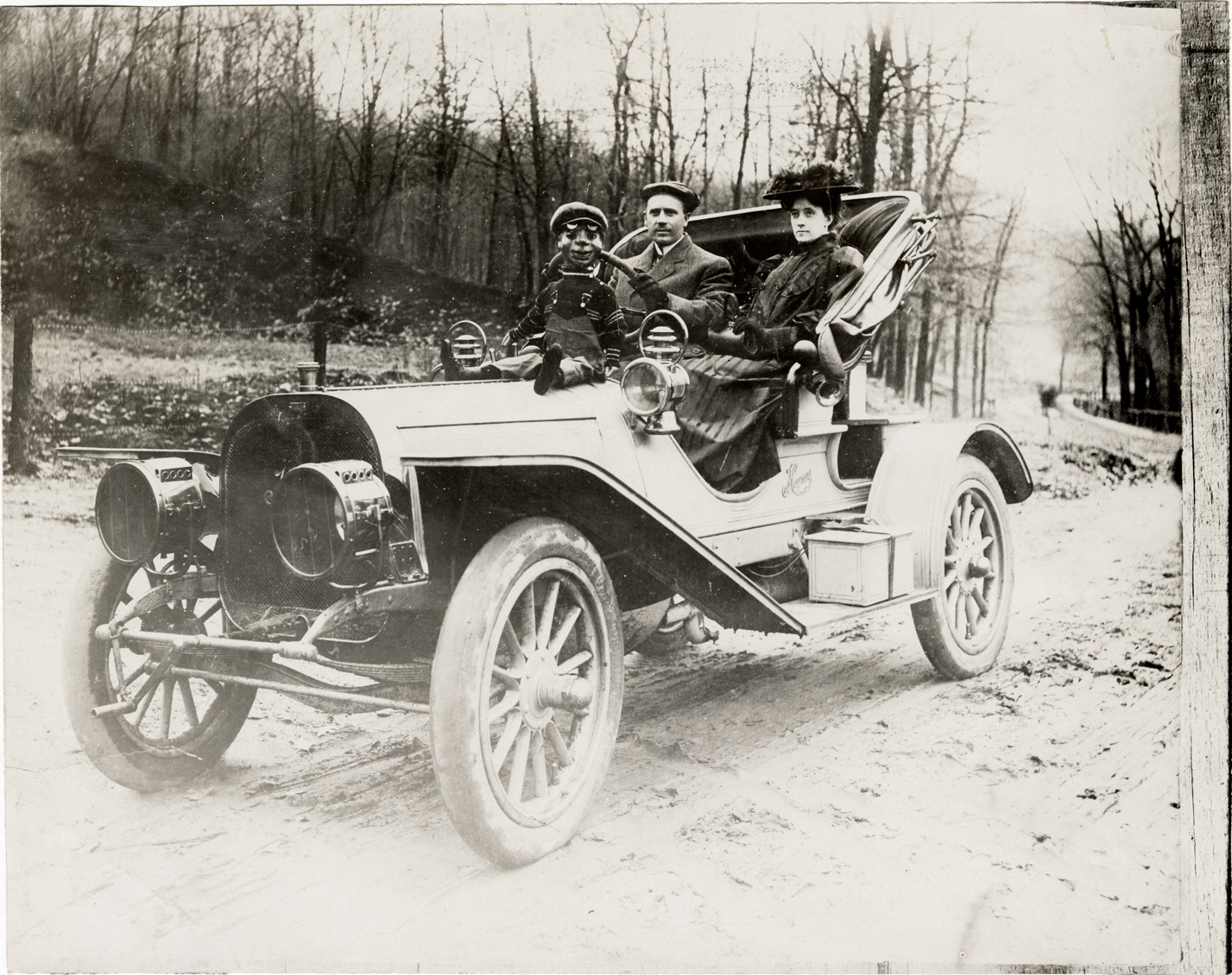 View of motorists and a ventriloquist's dummy posing in a Haynes car. Handwritten on back: "Haynes, ca. 1908."