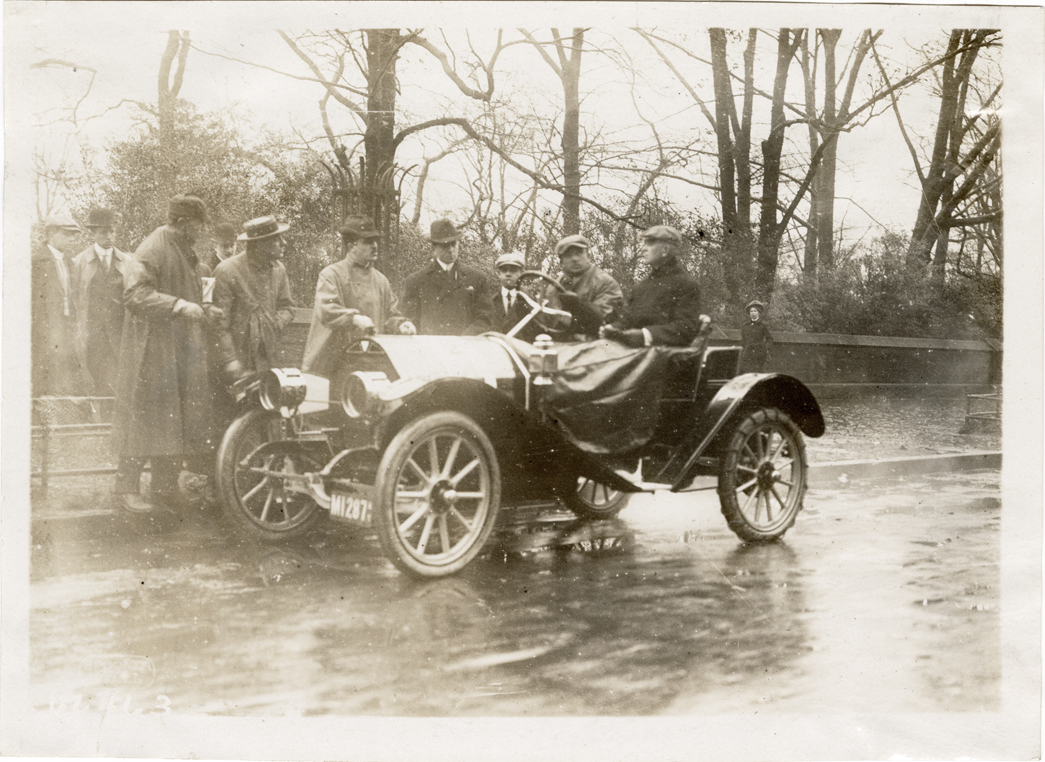 View of motorists in a 1910 Model 20 Hudson roadster. Onlookers in background. Stamped on back: "Spooner & Wells, Inc., photographers, telephones 3472-3473 Columbus, 1931 Broadway, New York." Handwritten on back: "Hudson, 1910. (Model 20) roadster."