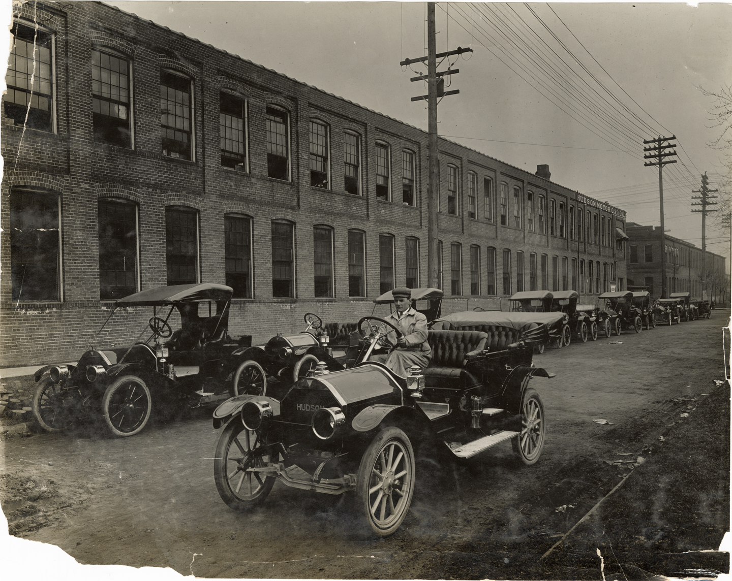 View of a man posing in a Hudson car in front of Hudson Motor Car Company factory. Row of Hudson cars is parked alongside building. Handwritten on back: "Hudson Motor Car Co. factory, ca. 1910."