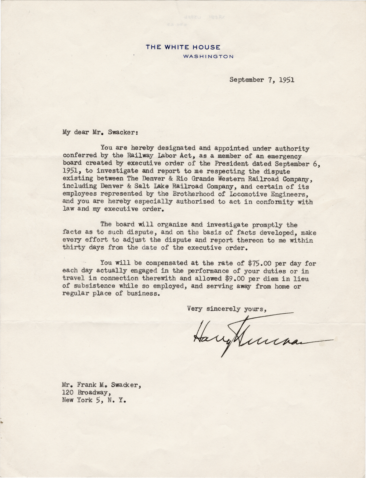 Letter from President Harry S. Truman to Frank M. Swacker, appointing him to an emergency board to investigate a labor dispute between the Denver and Rio Grande Western Railroad Company and the Brotherhood of Locomotive Engineers.