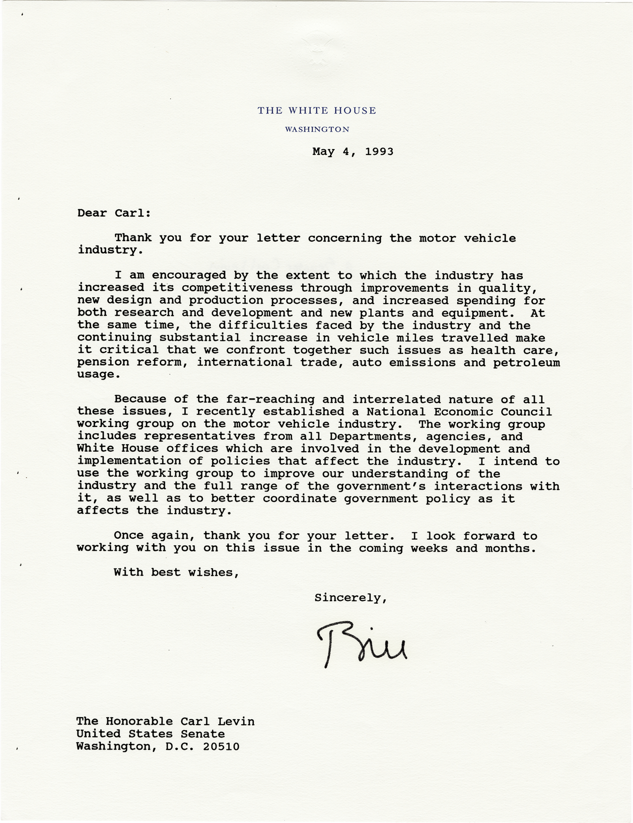 Letter from President Bill Clinton to U.S. Senator Carl Levin, thanking him for his correspondence and discussing the establishment of a National Economic Council working group on the motor vehicle industry.