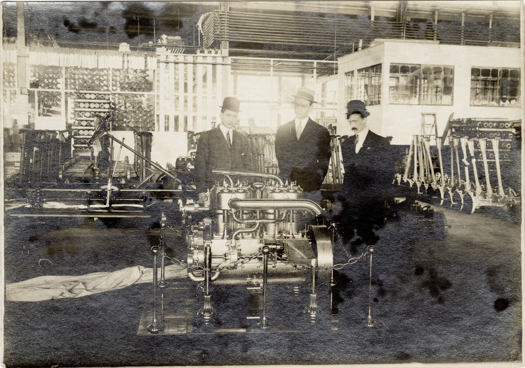 View of men posing with an engine for an Inter-State car. Handwritten on back: "Inter-State, app. 1909."