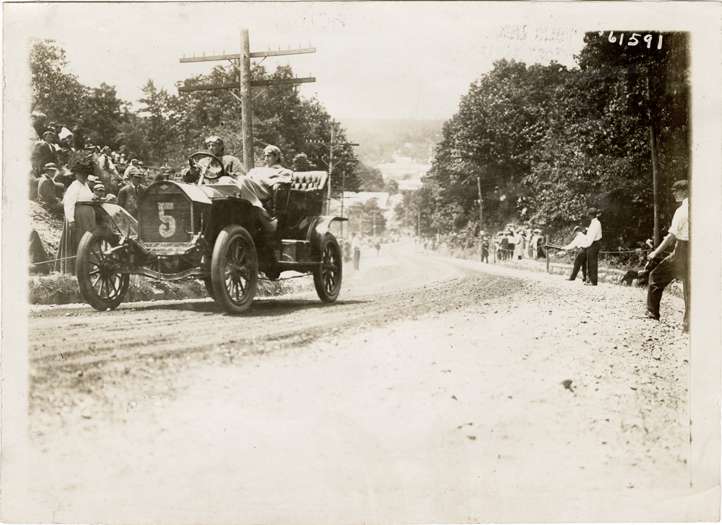 View of motorists in Jackson car no. 5. Spectators on roadside. Stamped on back: "Spooner & Wells, Inc., photographers, telephones 3472-3473 Columbus, 1931 Broadway, New York." Handwritten on back: "Jackson, ca. 1910."