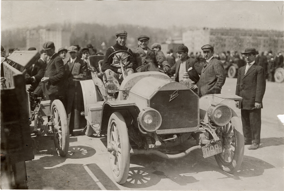 View of motorists and onlookers posing with a 1909 Knox car. Stamped on back: "Spooner & Wells, Inc., photographers, telephones 3472-3473 Columbus, 1931 Broadway, New York." Handwritten on back: "Knox, 1909."