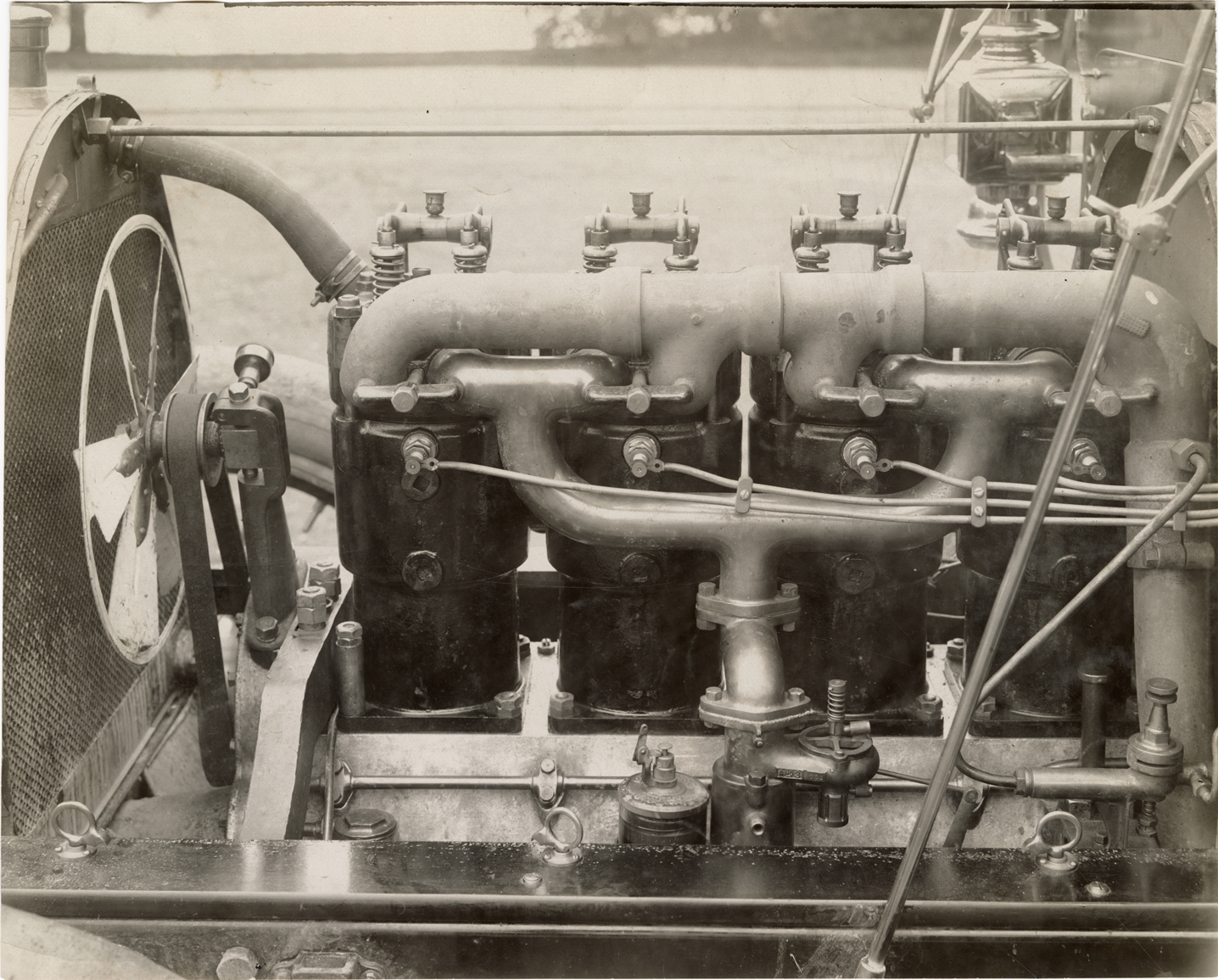 Close-up view of an engine for a Knox car. Handwritten on back: "Knox, ca. 1908."