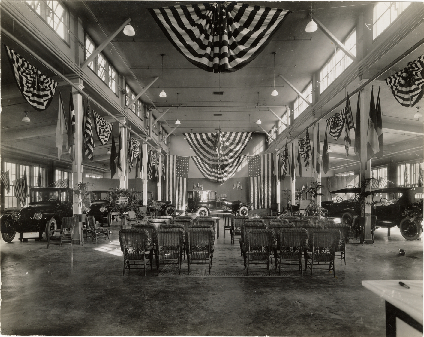 View of Lincoln cars on display in showroom. Rows of wicker chairs in foreground; room is decorated with bunting. Handwritten on back: "Showroom, Lincoln cars 1920-1922. L-R: Body type #104 ~ 4-p. coupe ~ 130" whb ~ body built by Murray. Body type #109 ~ 7-p. town car ~ 136" whb ~ body built by Murray. Body type #104 ~ 4-p. coupe (shown in the white) ~ 130" whb ~ Murray-built. Body type #103 ~ 5-p. phaeton ~ 130" whb ~ body built by Murray. Body type #102 ~ 3-p. roadster ~ 130" whb ~ body built by Murray."