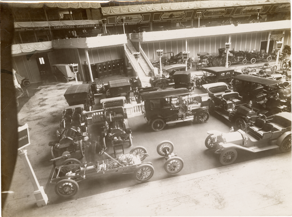 Overhead view of Locomobile cars and chassis on display at trade show. Stamped on back: "N. Lazarnick, 29 West 42nd Street, New York." Handwritten on back: "Locomobile, '09."