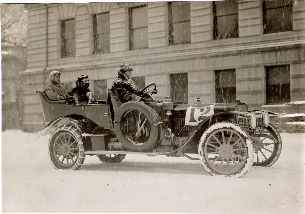 View of motorists in 1908 Lozier car no. 12 on snow-covered road during winter. Stamped on back: "Spooner & Wells, Inc., photographers, telephones 3472-3473 Columbus, 1931 Broadway, New York." Handwritten on back: "#12 Lozier, driver H. [undecipherable] perfect score."