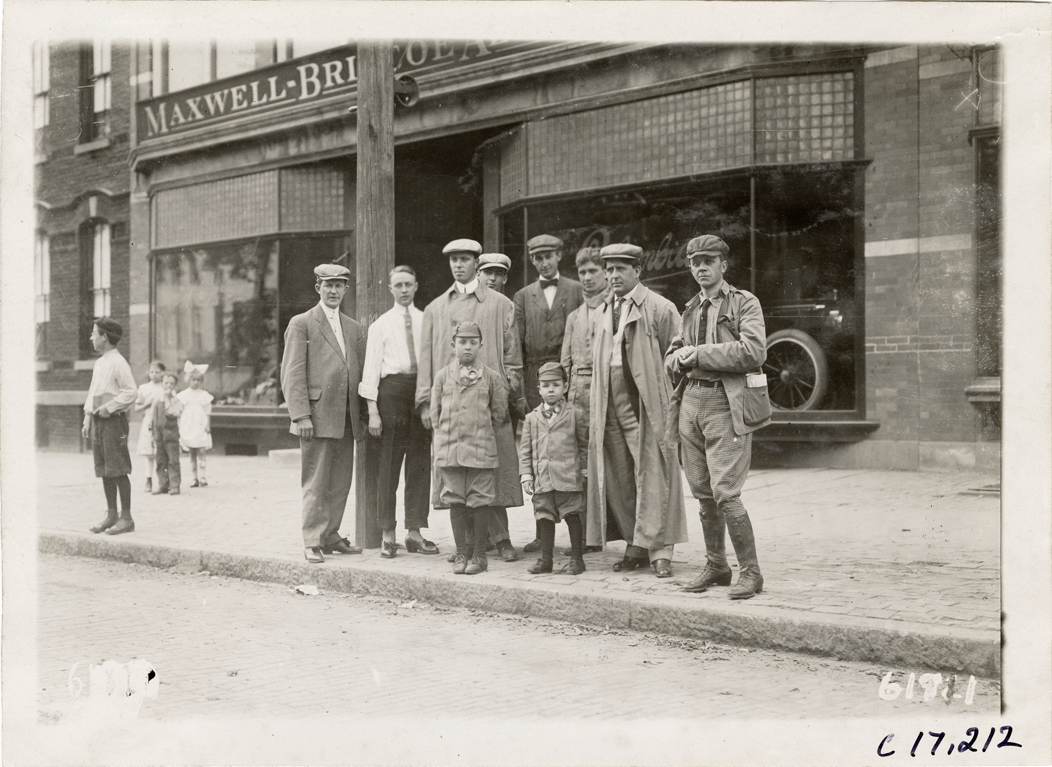 View of Louis, Temple and Jack Abernathy posing with group of men on sidewalk. Maxwell-Briscoe Co. dealership in background. In 1910, Louis and Temple Abernathy, ages 9 and 6, drove a Brush car from New York to Oklahoma City. They were accompanied by their father, Jack, and other motorists. Stamped on back: "Spooner & Wells, Inc., photographers, telephones 3472-3473 Columbus, 1931 Broadway, New York." Handwritten on back: "Tours--Abernathy Kids New York to Oklahoma Tour, 1910."