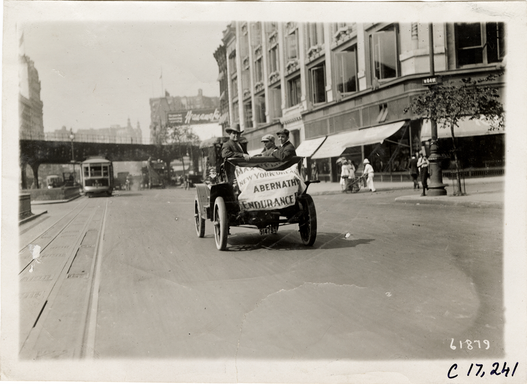 Rear view of Jack Abernathy and motorists posing in Maxwell car. In 1910, Louis and Temple Abernathy, ages 9 and 6, drove a Brush car from New York to Oklahoma City. They were accompanied by their father, Jack, and other motorists. Stamped on back: "Spooner & Wells, Inc., photographers, telephones 3472-3473 Columbus, 1931 Broadway, New York." Handwritten on back: "Tours--Abernathy Kids New York to Oklahoma Tour, 1910."