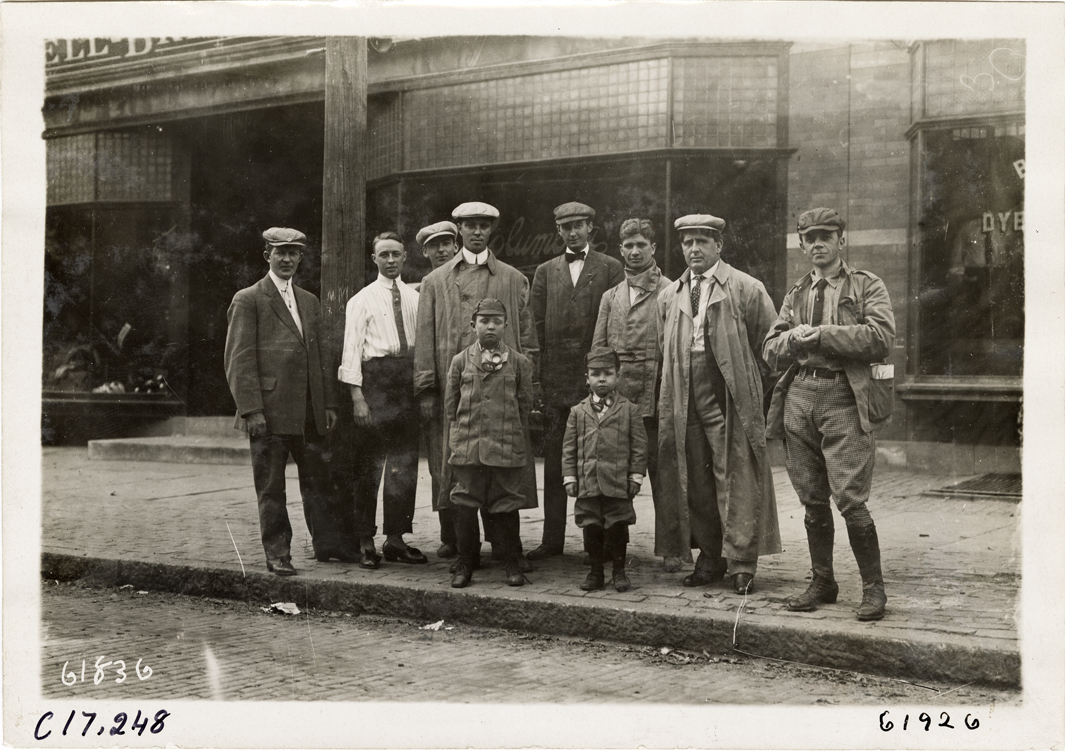 View of Louis, Temple and Jack Abernathy posing with group of men on sidewalk. Maxwell-Briscoe Co. dealership in background. In 1910, Louis and Temple Abernathy, ages 9 and 6, drove a Brush car from New York to Oklahoma City. They were accompanied by their father, Jack, and other motorists. Stamped on back: "Spooner & Wells, Inc., photographers, telephones 3472-3473 Columbus, 1931 Broadway, New York." Handwritten on back: "Tours--Abernathy Kids New York to Oklahoma Tour, 1910."