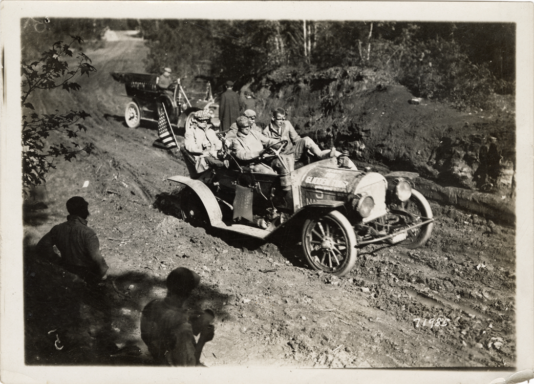 Motorists in 1911 Marathon automobile traveling on rural road, 1911 Glidden Tour