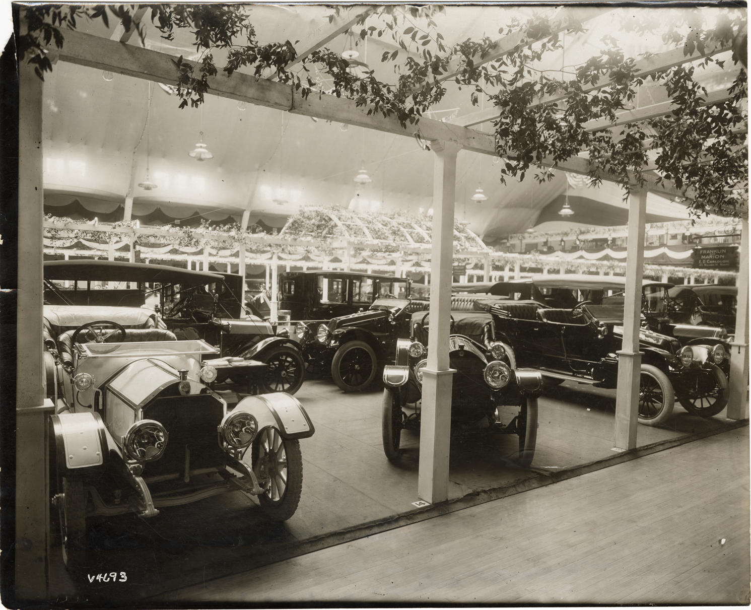View of Marion cars on display at trade show. Stamped on back: "Spooner & Wells, Inc., photographers, 1931 Broadway, N.Y. City, phones 3472-3473 Col." Handwritten on back: "Marion, ca. 1912."