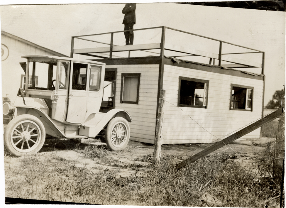 View of a Marmon car. Man stands on observation deck of wooden-frame building in background. Handwritten on back: "Marmon, ca. 1909."
