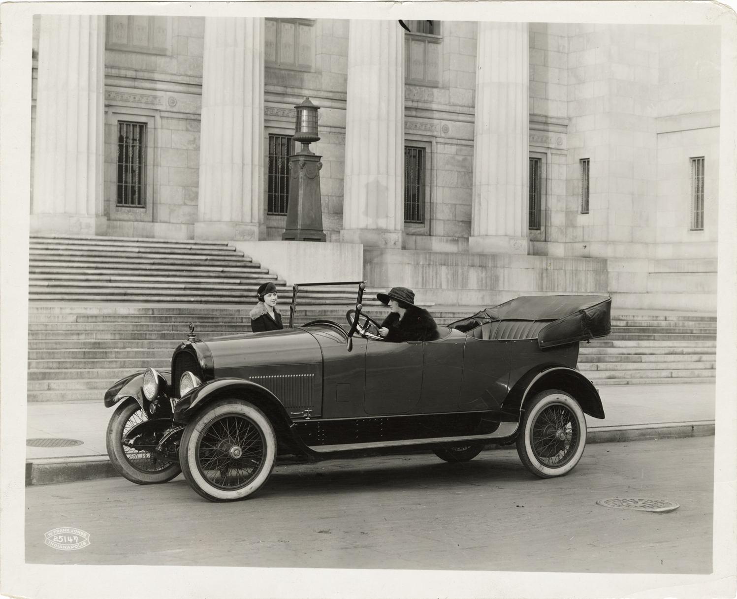 View of two women posing with a Marmon touring car. Stamped on back: "Marmon 34. Nordyke & Marmon Company. Indianapolis, Indiana." Handwritten on back: "7 pass. Touring car, new series. Marmon, c.1922."