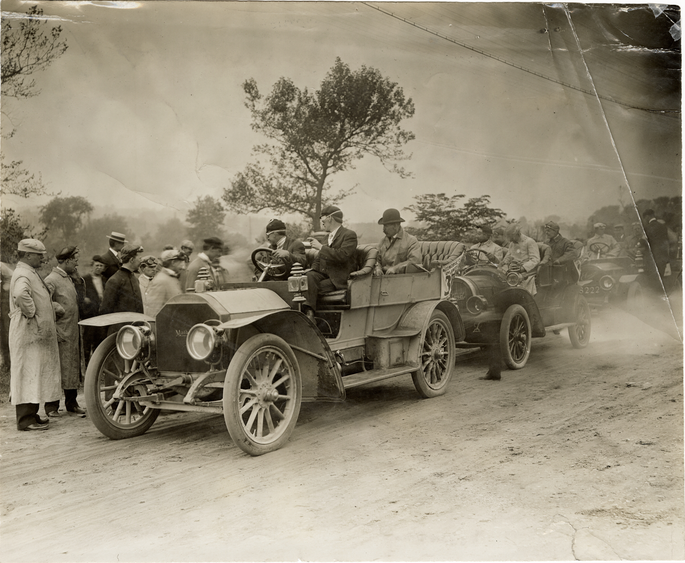 View of motorists in a Matheson car, followed by other cars. Onlookers stand on roadside. Handwritten on back: "Matheson, ca. 1907."