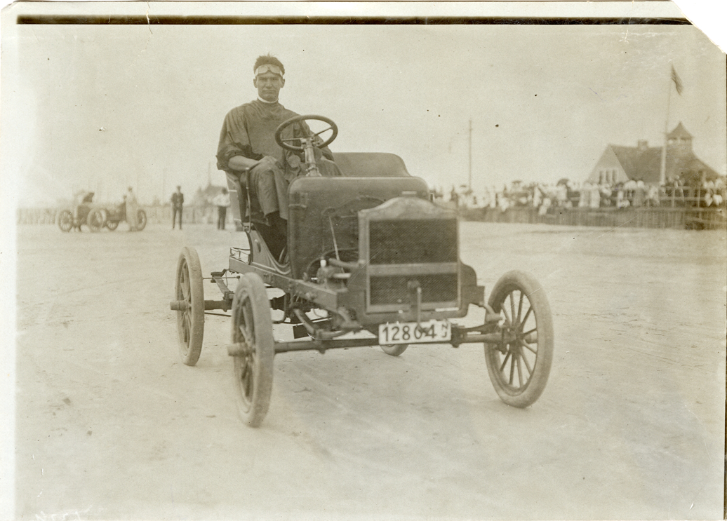 View of motorist posing in a Maxwell car on the beach. Stamped on back: "Photo by F. Ed. Spooner, 1536 B'way, telephone 6536-38th St., New York, N.Y." Handwritten on back: "Maxwell, ca. 1905."