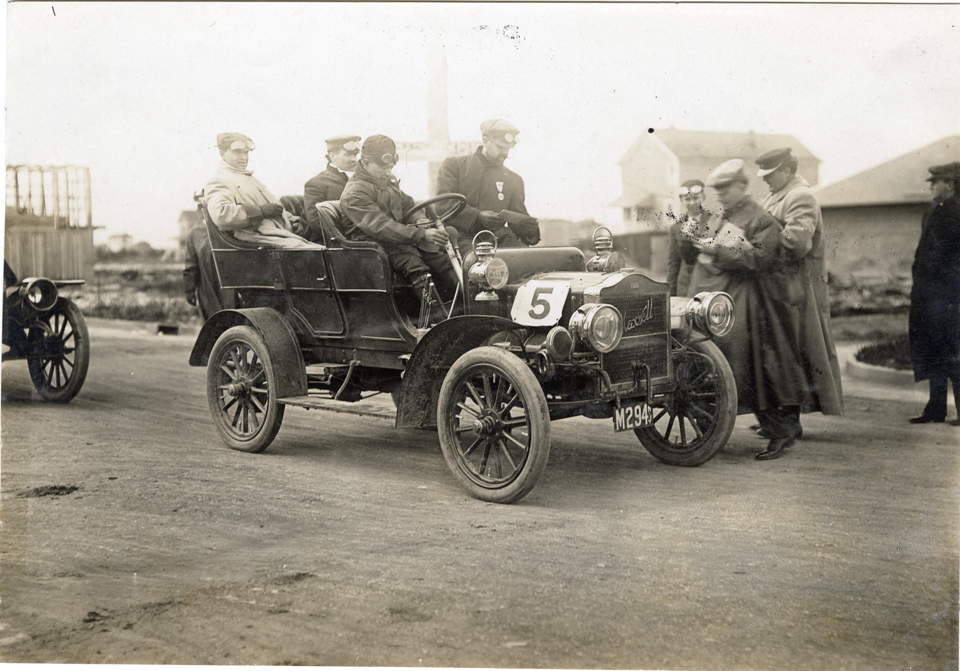 View of motorists in Maxwell car no. 5. Stamped on back: "Spooner and Wells, 1931 Broadway, New York, duplicates any time, enlargements all sizes, tel. 3472-3473 Col., credit appreciated." Handwritten on back: "Maxwell, ca. 1907. [undecipherable] Mason, Maxwell, AC."
