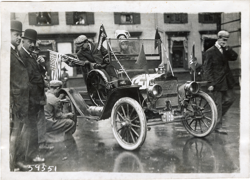 View of motorists in Maxwell car no. 24. "Harrisburg" pennant is displayed on car. Stamped on back: "Spooner & Wells, Inc., photographers, telephones 3472-3473 Columbus, 1931 Broadway, New York." Handwritten on back: "Maxwell, ca. 1910."