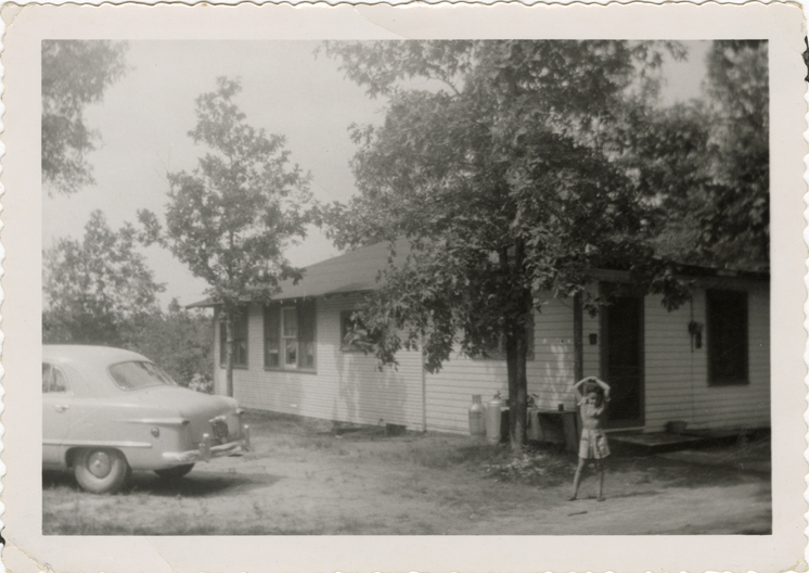 View of a girl posing in front of a cottage at the Idlewild resort community in Idlewild, Michigan. Automobile is partially visible on left.