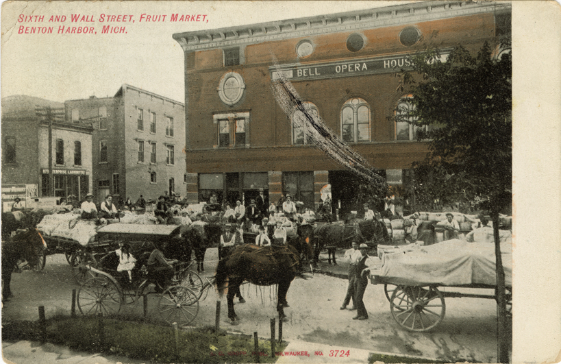 View of the fruit market located at Sixth and Wall Streets in Benton Harbor, Michigan. Horse-drawn wagons in foreground; Bell Opera House in background. Printed on front: "Sixth and Wall Street fruit market, Benton Harbor, Mich." Handwritten on back: "Dear [undecipherable], am going to Flo's this week will write you from there am wondering if you are still going hope so. I think will go to this Thursday morn. Helen." Card is postmarked August 1, 1910.