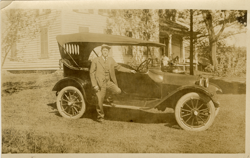 View of a motorist posing with a car. Wooden-frame house in background.