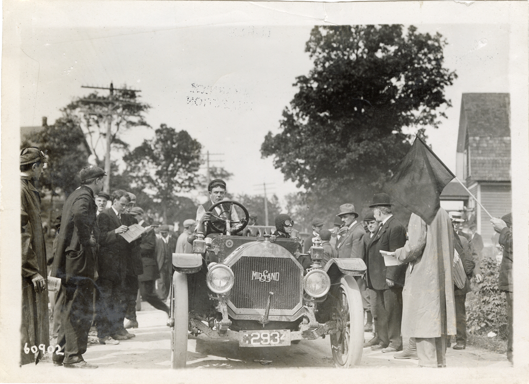 View of motorists posing in a Midland car, surrounded by onlookers. Stamped on back: "Spooner & Wells, Inc., photographers, telephones 3472-3473 Columbus, 1931 Broadway, New York." Handwritten on back: "Midland, ca. 1910."